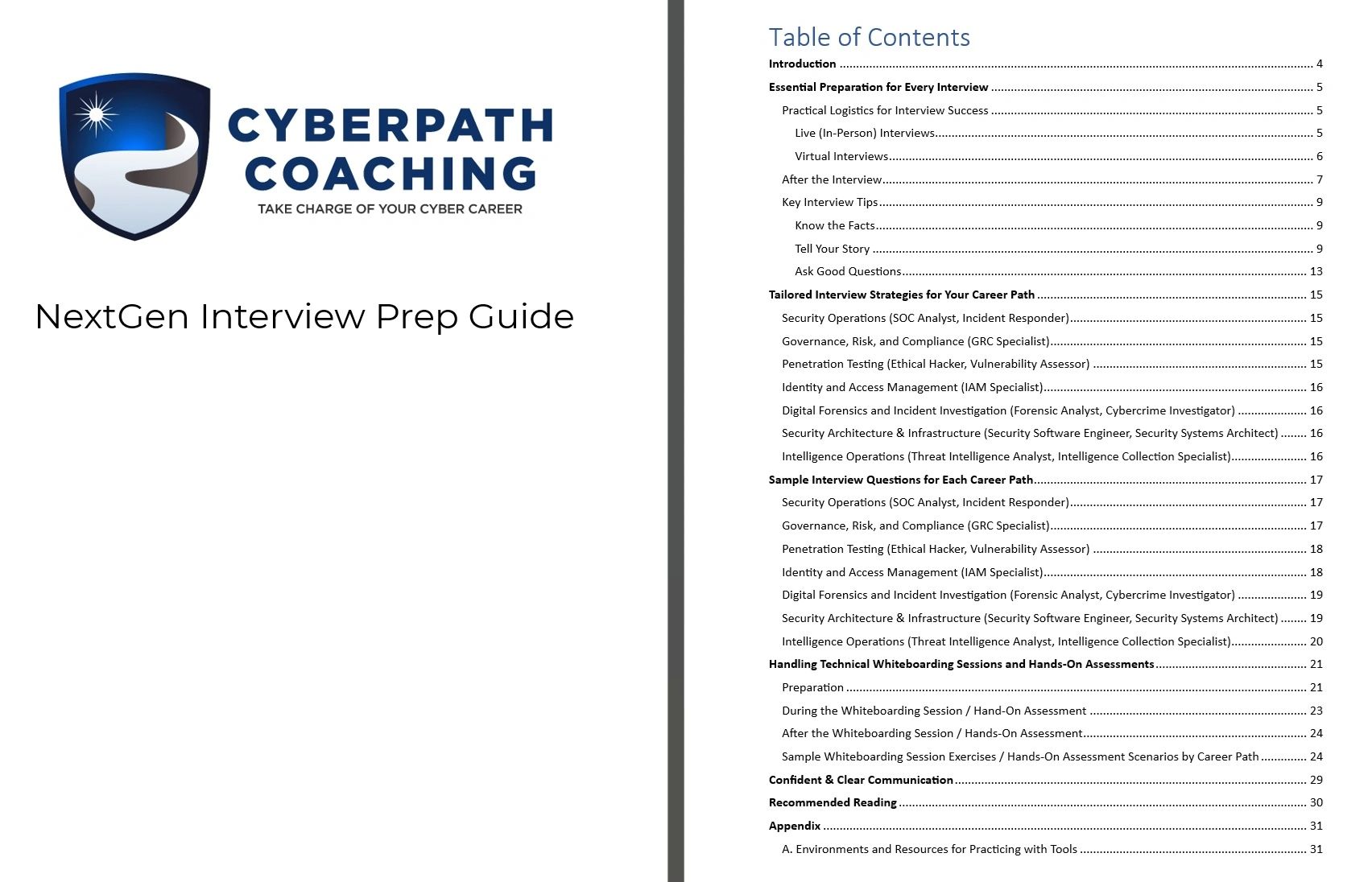 The NextGen Cyber Interview Prep Guide is a comprehensive resource for mastering cybersecurity job interviews. This guide combines proven interview strategies and insights into what today's hiring managers are looking for. Whether you're interviewing virtually or in person, you'll find actionable approaches to showcase your technical expertise and professional value effectively.